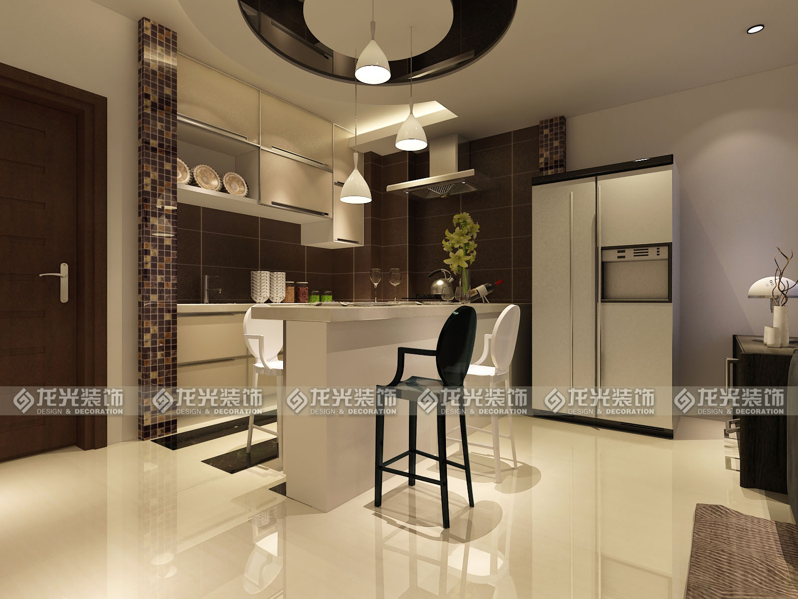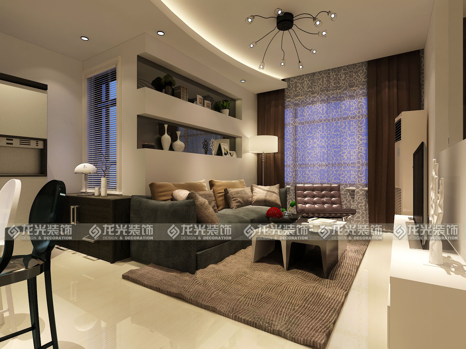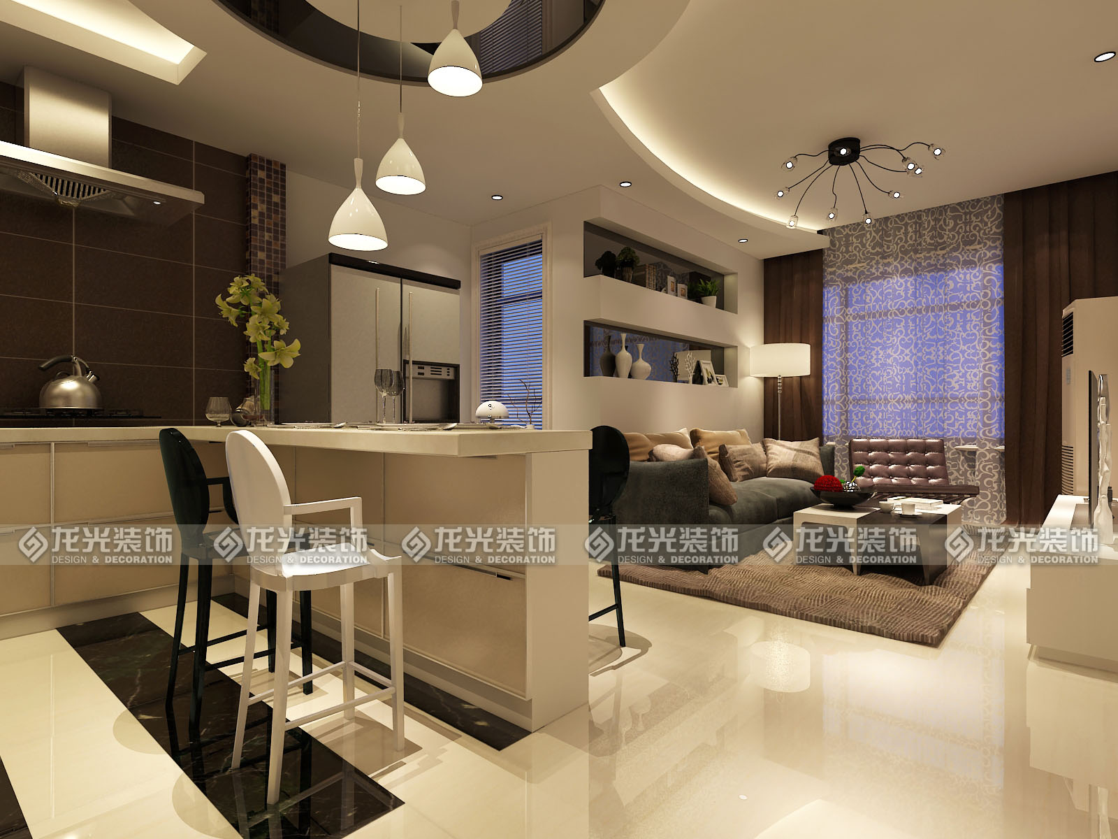 本案是給一對(duì)年輕夫婦打造的休閑度假公寓,定義為現(xiàn)代風(fēng)格,用黑白灰三色為主色調(diào),材質(zhì)以鏡面,瓷磚,壁紙來(lái)搭配,墻體的拆除將整個(gè)房間的空間感打開(kāi),頂面圓弧型的造型讓空間更為靈動(dòng),不單一,敞開(kāi)廚房,通透的衛(wèi)生間玻璃,都為了讓整個(gè)空間顯得格外明亮。