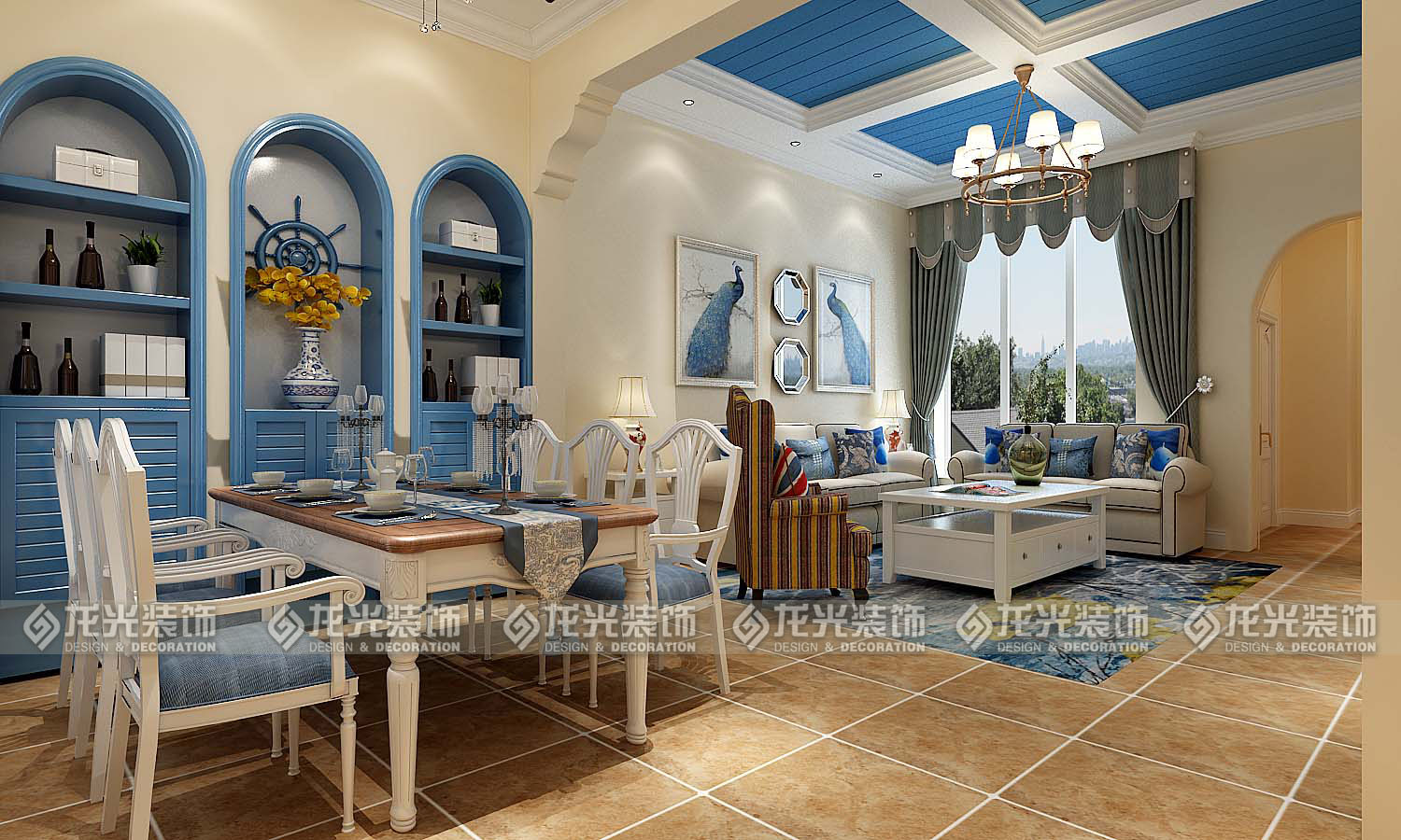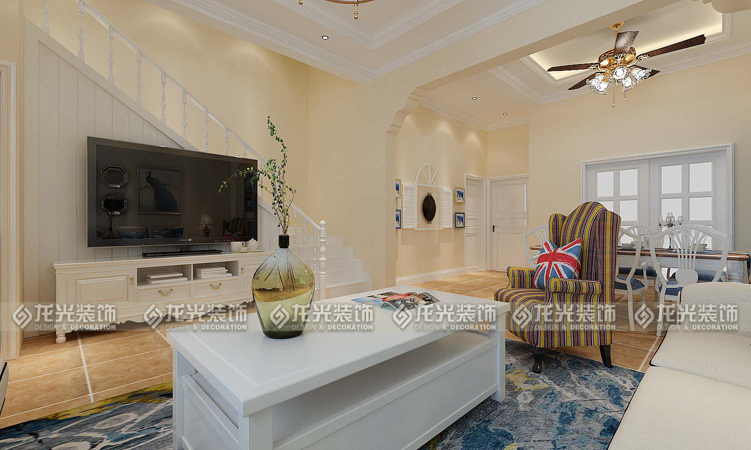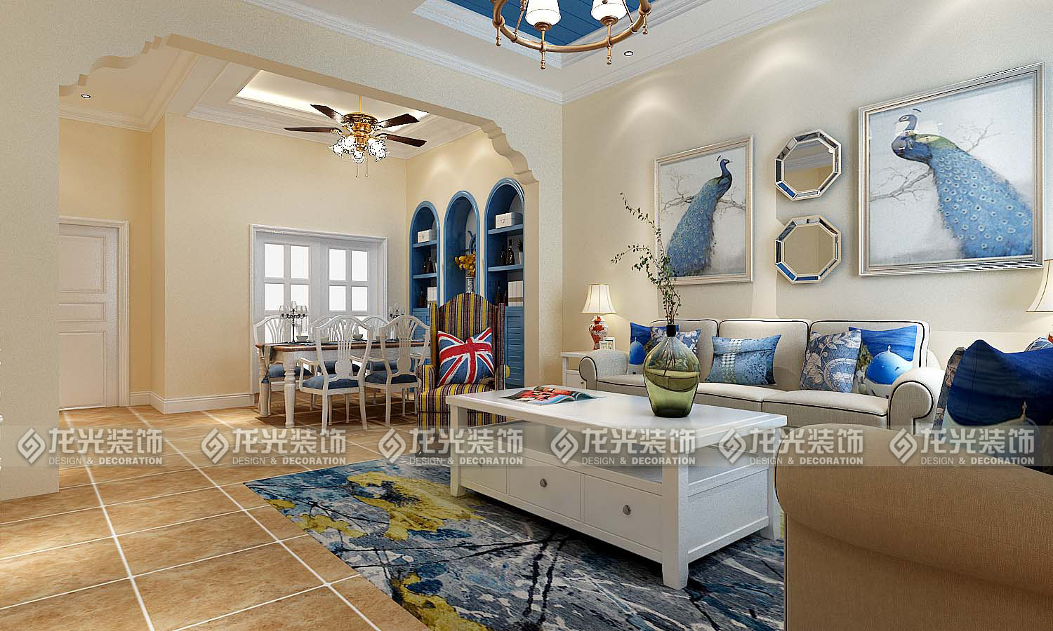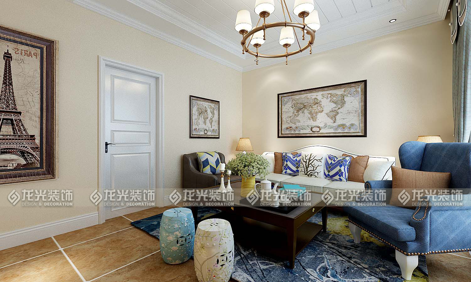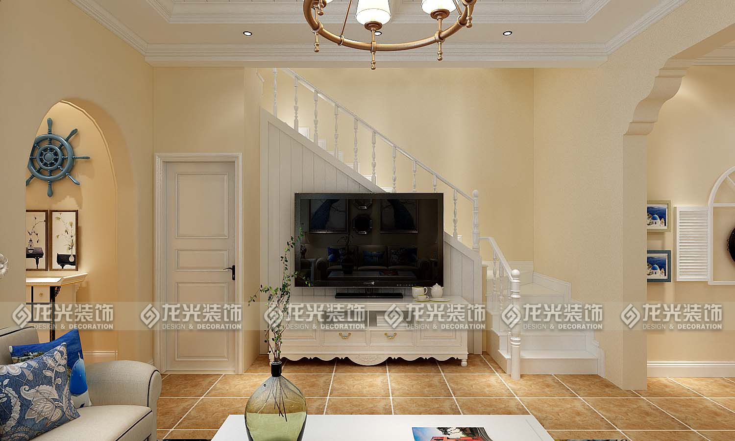 本案例整體風格為地中海風格,地中海風格是明亮、大膽、色彩豐富、簡單、民族性、有明顯特色。地中海風格的美,包括“海”與“天”明亮的色彩、仿佛被水沖刷過后的白墻、薰衣草、玫瑰、茉莉的香氣、路旁奔放的成片花田色彩、歷史悠久的古建筑、土黃色與紅褐色交織而成的強烈民族性色彩。運用文化石的質感、清新的布藝沙發、復古的拼花地板、暖色的墻面、流露出一股濃濃的地中海風情!