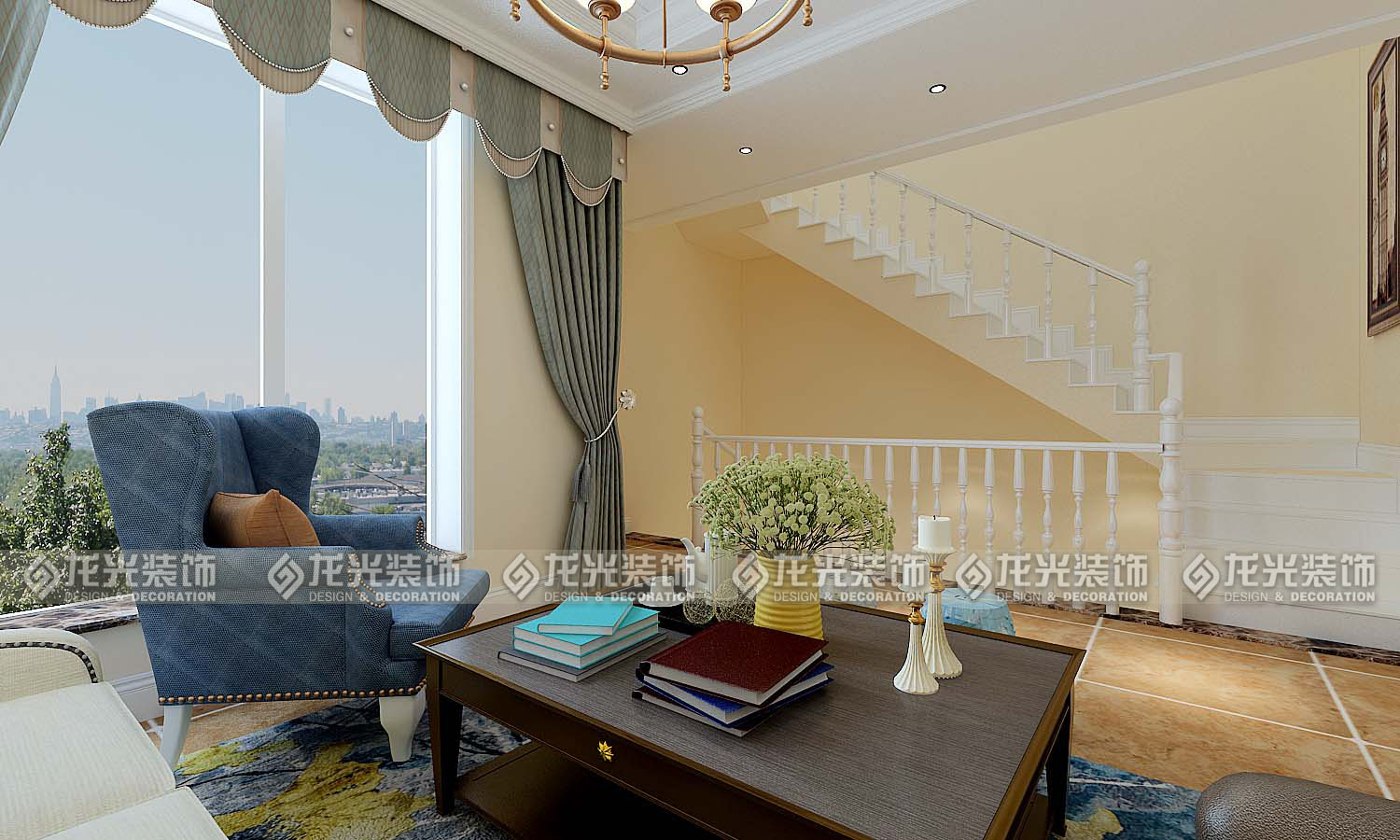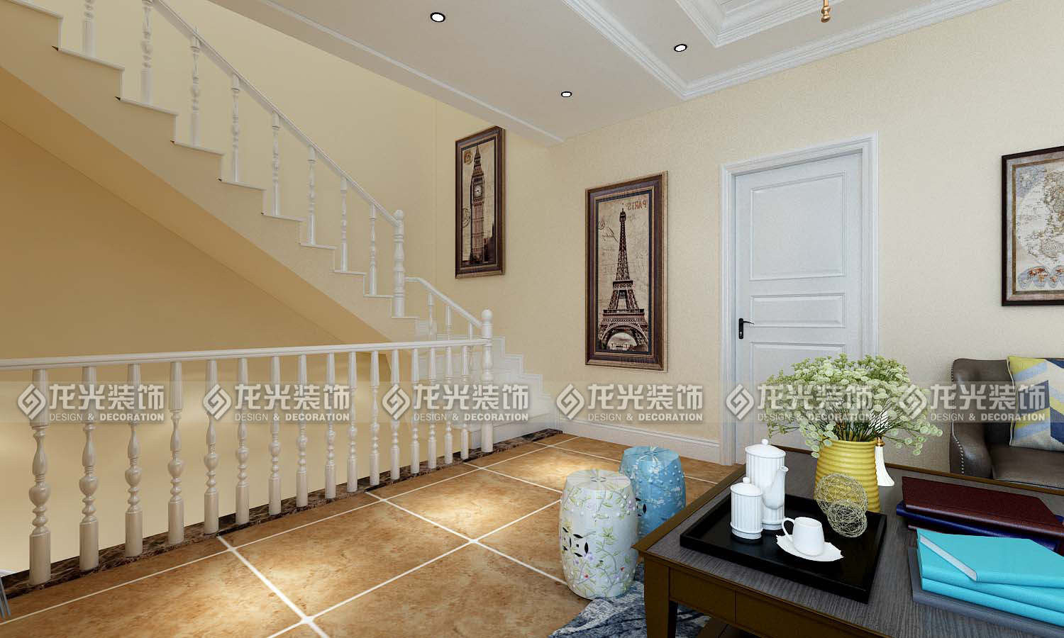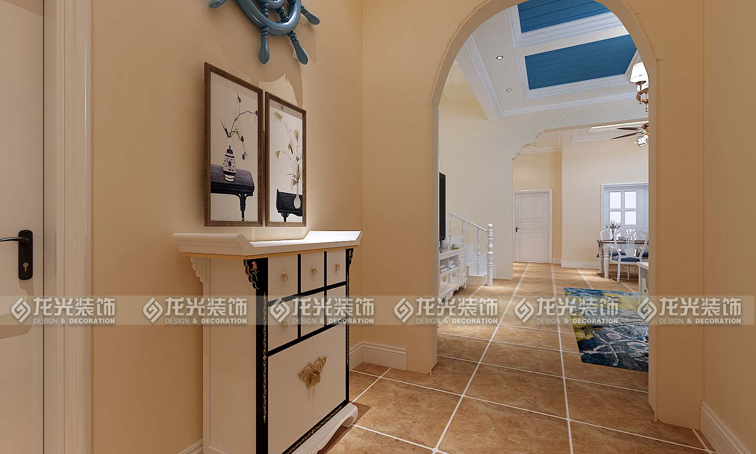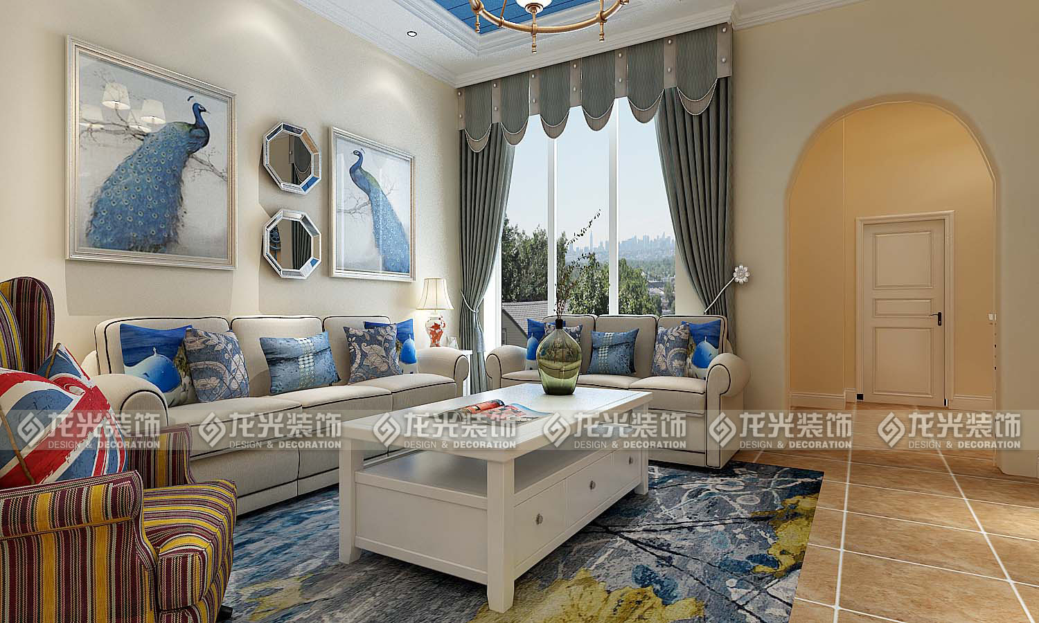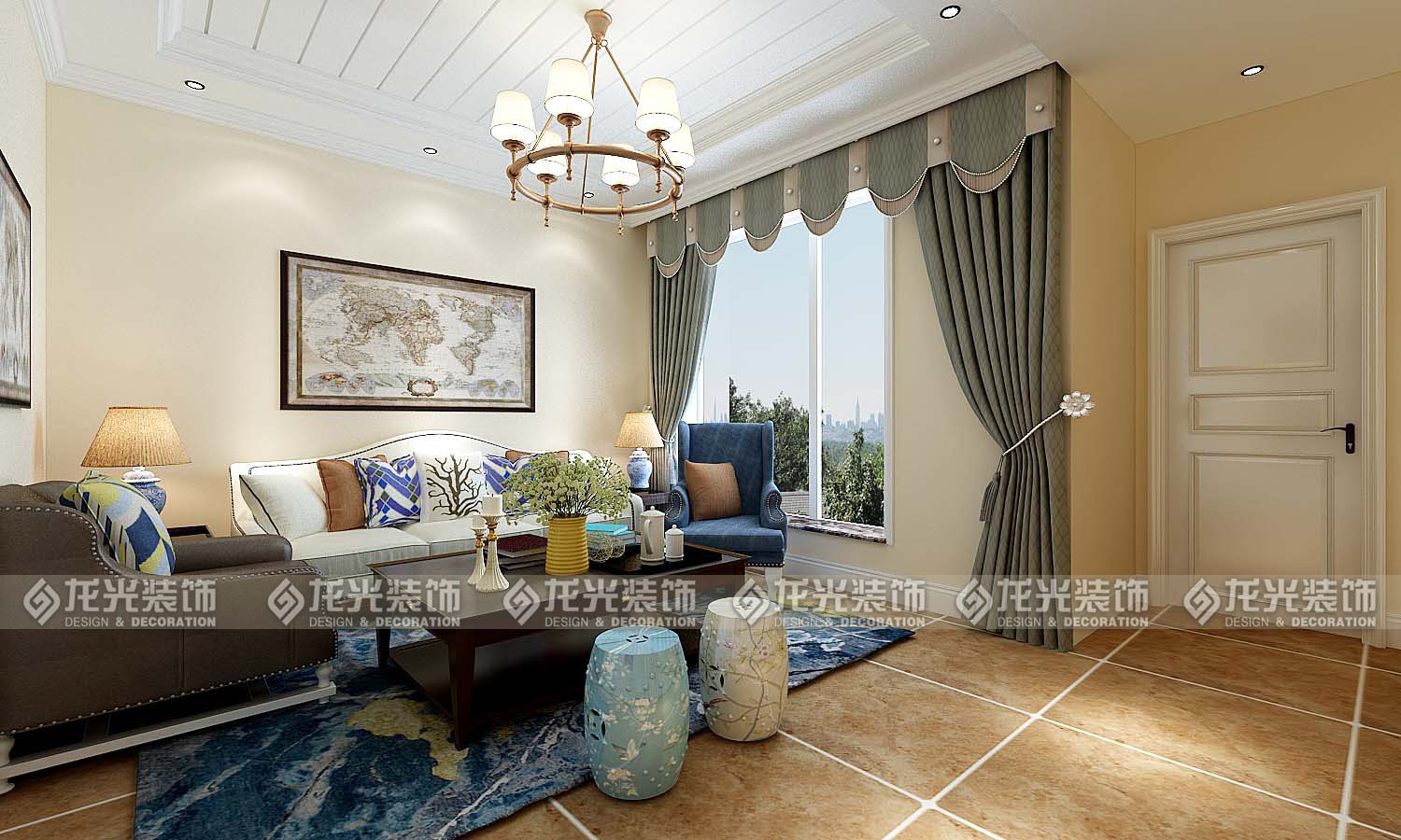本案例整體風格為地中海風格,地中海風格是明亮、大膽、色彩豐富、簡單、民族性、有明顯特色。地中海風格的美,包括“海”與“天”明亮的色彩、仿佛被水沖刷過后的白墻、薰衣草、玫瑰、茉莉的香氣、路旁奔放的成片花田色彩、歷史悠久的古建筑、土黃色與紅褐色交織而成的強烈民族性色彩。運用文化石的質感、清新的布藝沙發、復古的拼花地板、暖色的墻面、流露出一股濃濃的地中海風情!