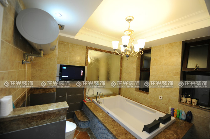 4 衛生間區域采用了天然理石和瓷磚相結合, 墻面的深淺瓷磚用咖啡色的天然理石過渡,使得整體墻面融為一體,浴盆的立面用淡藍色的馬賽克,使得整體空間更加豐富多彩,淡淡的藍色猶如一潭湖水,使人心情舒暢,浴盆的邊緣采用小階梯式設計,在老人起來會方便,也不會過多占用整體空間面積。