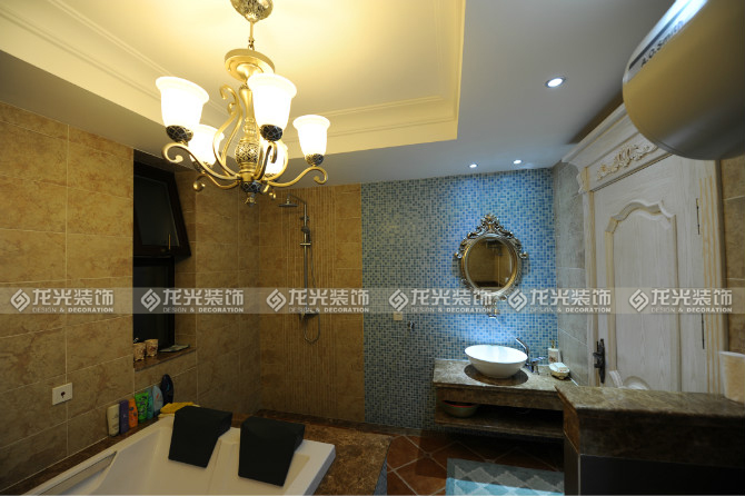5洗面臺不同以往木質材質,而是用天然理石制作,雙層的設計增加了層次感,洗面臺背景的藍色馬賽克和浴盆的立面采用對稱設計,藍色元素的運用增加了空間的色彩感,淋漓盡致的體現了地中海風格色彩的豐富性,銅質雕刻洗面鏡會使人聯想到古老的歷史。
