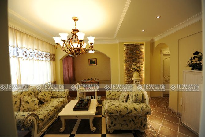 1客廳區域,色彩豐富,背景墻以文化石造型為基礎,也是本案一大突出是亮點,使人進門后有種回歸自然的感覺,淡米色的墻面會使人感覺到幸福、陽光、快樂,客廳中心的拼花式地板會有一種視覺的沖擊感,客廳銅質吊燈更加體現出復古的韻味,實木的質感紋理和文化石相得益彰。