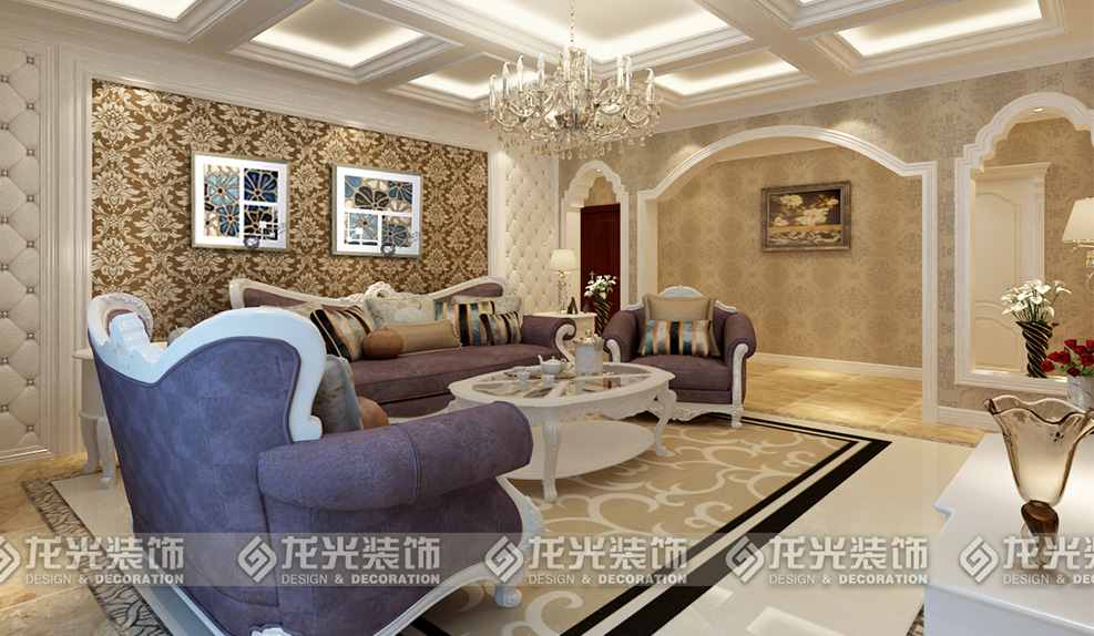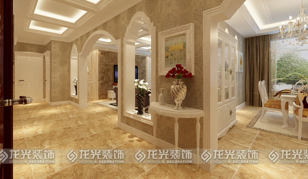 1、門廳過廊區域采用米黃色大理石瓷磚進行鋪貼,過廊頂部運用多個回字形懸浮吊頂,充分的將歐式風格的高端大氣的感覺展現出來,造型頂既增加了過廊的延伸感,又使整個區域的頂地造型有了很好的呼應,由于客廳跨度比較寬,采用三個拱形埡口造型,使得空間更有層次,兩側的埡口可以以屏風隔斷的形式存在,劃分出客廳與過廊之間的區域。